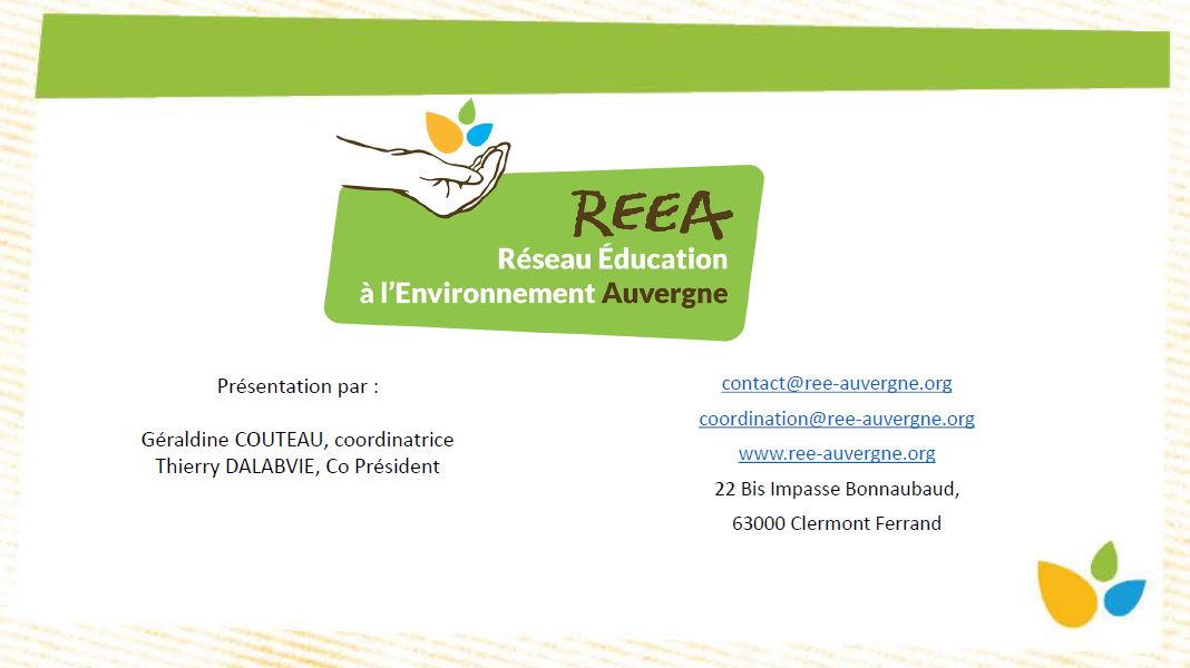 1- La mise en réseau des acteurs autour de l’EEDDMissions, acteurs, actions pédagogiques et collectives, thématiques de travail… Quels enjeux et modalités de partenariat entre collectivités locales et acteurs de l’EEDD ? Illustration à travers l’exemple du Réseau Éducation à l’Environnement Auvergne. Thierry DALBAVIE & Géraldine COUTEAU – Réseau Éducation à l’Environnement Auvergne | |