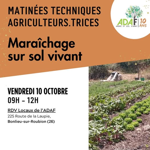 | MATINEE TECHNIQUE - Maraichage sur sol vivant Vendredi 10 octobre 2025 - 9h/12h - Bonlieu-sur-Roubion (26) | |