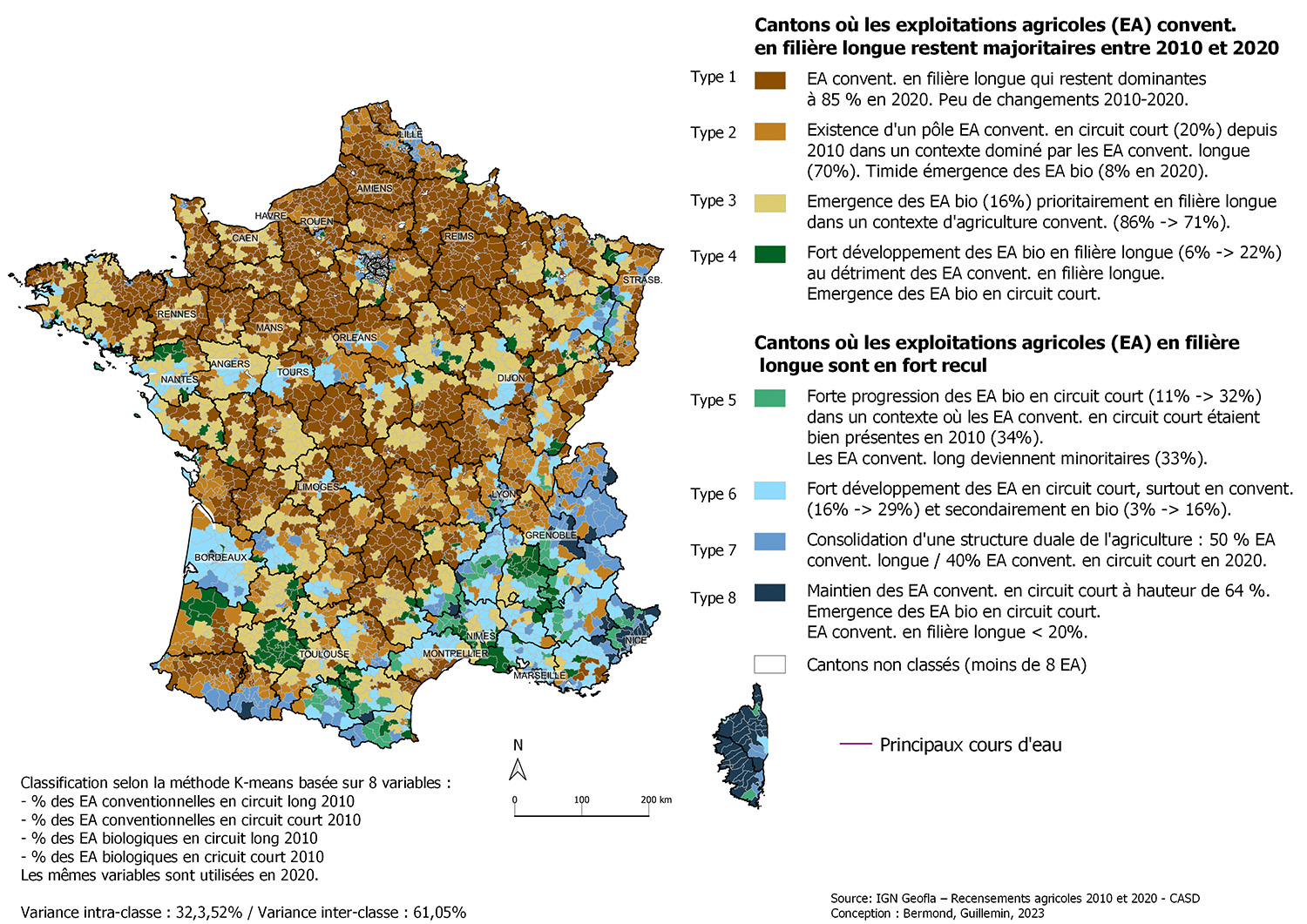 | L'objectif de cet article est de caractériser des dynamiques d'évolution d'agricultures en transition entre 2010 et 2020 à échelle fine sur le territoire métropolitain. Cette géographie repose sur une typologie des exploitations agricoles combinant modes de production agricole (biologique ou non) et de commercialisation des produits (circuits courts ou long). |