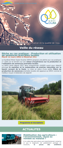 | | Pêche au cas pratique - Production et utilisation de semences prairiales locales Mardi 12 mars 2024 à Mézériat (01) | | | Le Syndicat Mixte Veyle Vivante (SMVV) propose une pêche aux cas pratiques (= visite sur le terrain) sur son retour d'expérience sur la production et l’utilisation de semences prairiales locales. Le SMVV porte depuis 2021 deux programmes LEADER ayant pour objectif principal le maintien et la restauration de prairies naturelles sur le bassin versant de la Veyle. La mise en place d’une petite filière de production de semences prairiales locales est apparue au SMVV comme le meilleur moyen d’atteindre cet objectif. | | | | | | |